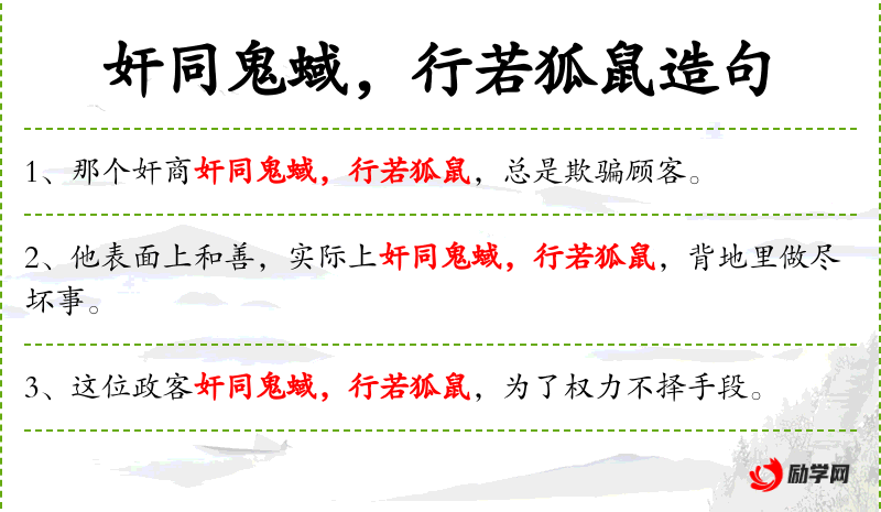 - 谓语:“奸同鬼蜮,行若狐鼠”