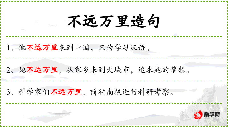 1. 【不远万里】 不以万里为远。形容不怕路途遥远。