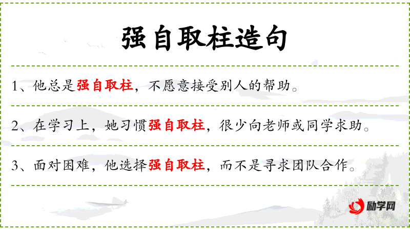 句子:“在学上,她惯强自取柱,很少向老师或同学求助。”