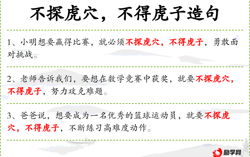 - 同学建议,要在辩论赛中胜出,我们需要有勇气直面对方的观点,这正是“不探虎穴,不得虎子”的体现。