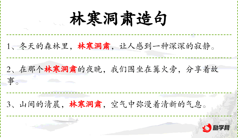 4. 【林寒洞肃】 - 寒:寒冷;肃:肃杀。形容秋冬时林木萧疏,溪涧浅落的景象。