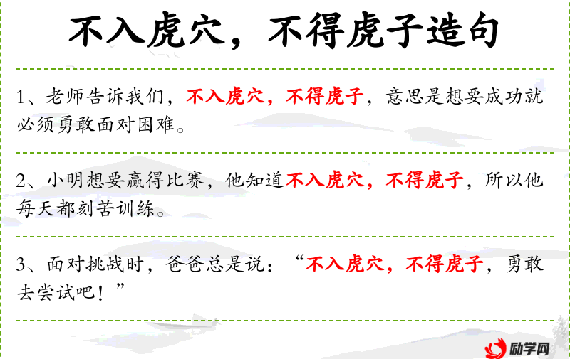 - 文化背景:**文化中,成语“不入虎穴,不得虎子”常用来鼓励人们勇敢面对困难和风险。