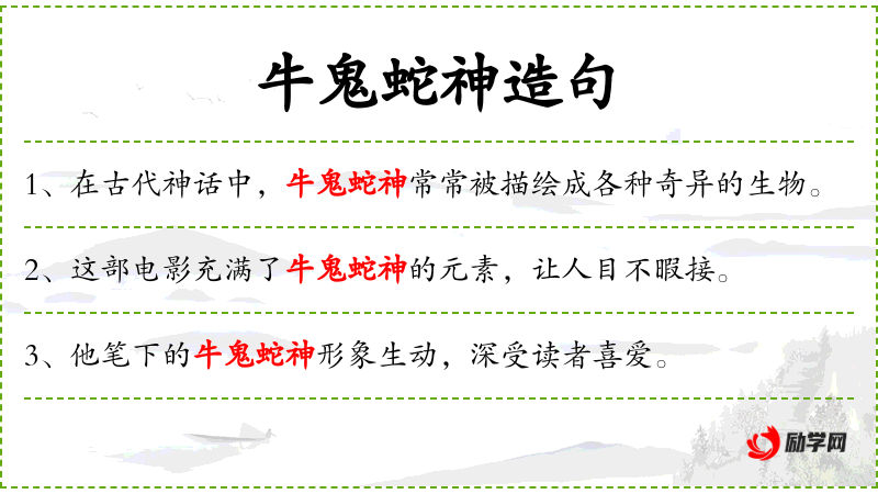 3. 【牛鬼蛇神】 - 牛头的鬼,蛇身的神。原形容虚幻怪诞。后比喻社会上形形色色的坏人。