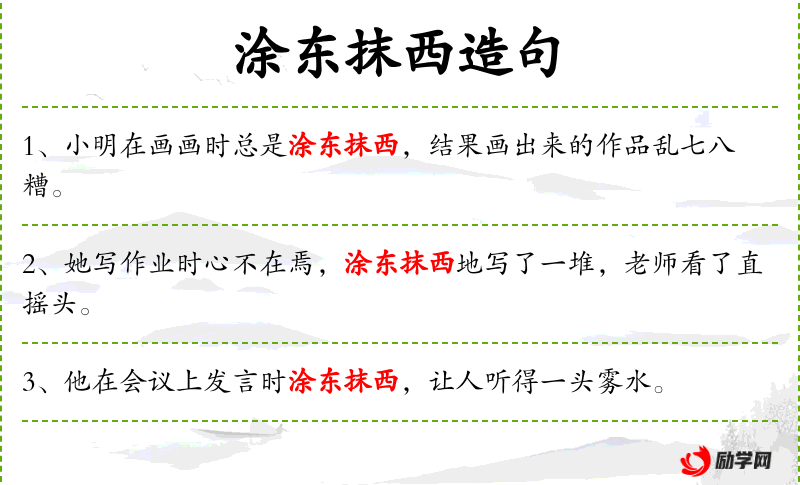 3. 【涂东抹西】 - 涂、抹:原喻从事文辞。比喻用笔随便写写画画。