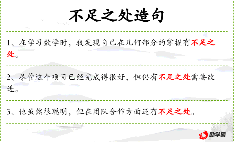 - 宾语:无直接宾语,但“不足之处”可以视为隐含的宾语