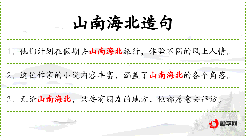 - 山南海北:这个成语体现了**人对广泛探索的向往。