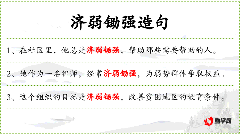 2. 【济弱锄强】 - 济:帮助;锄:铲除。帮助弱者,铲除强暴。