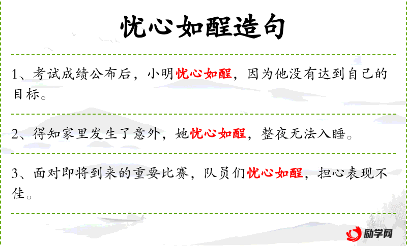 - 忧心如酲:成语,形容非常忧虑,如同醉酒一般。