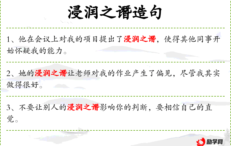 1. 【浸润之谮】 - 比喻暗中诽谤别人的坏话。