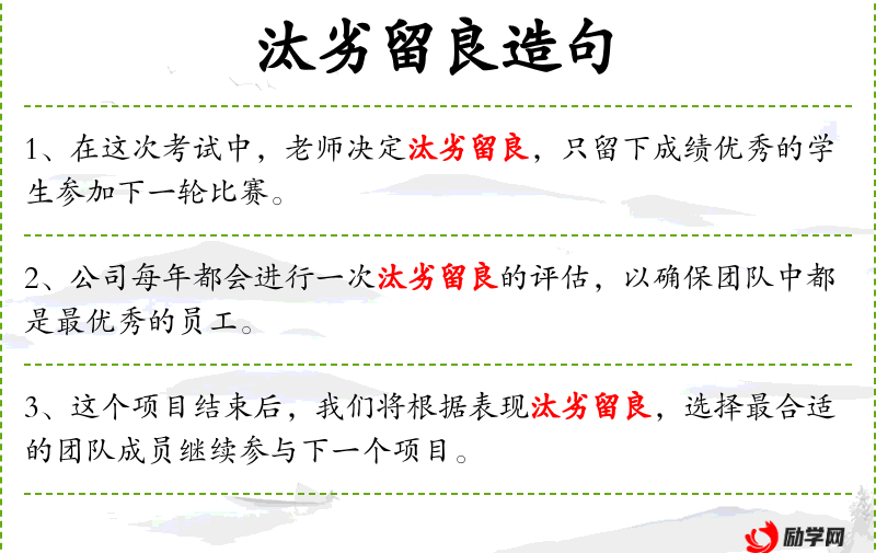 4. 【汰劣留良】 指淘汰掉低劣的而留下精良的。