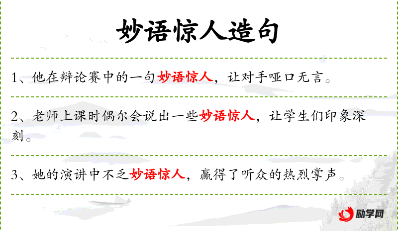 - 妙语惊人:指言辞巧妙、出人意料,给人留下深刻印象。