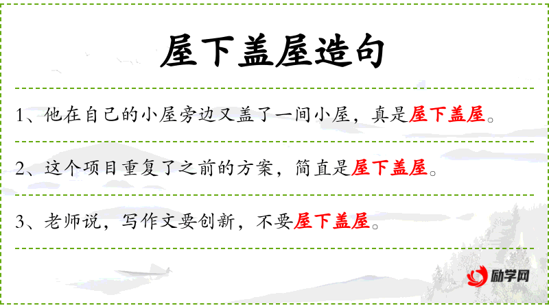 - 屋下盖屋:成语,比喻在原有的基础上重复建设,缺乏创新。