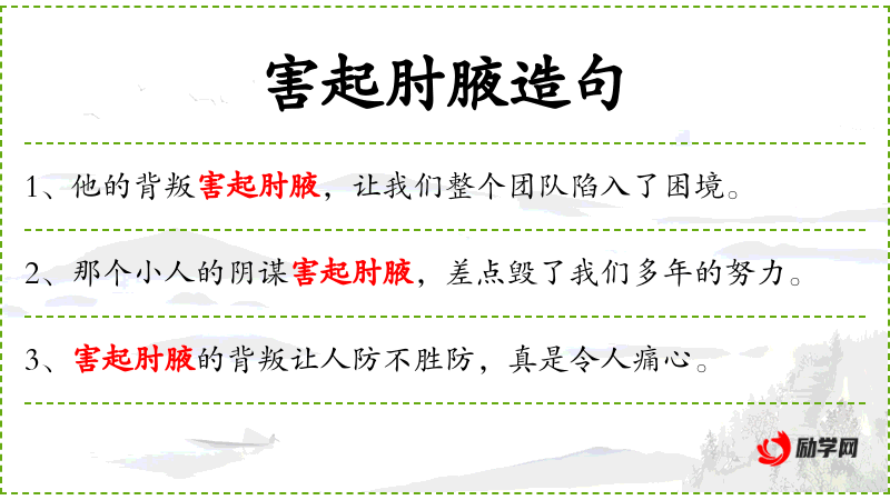 - “害起肘腋”:这个成语字面意思是“伤害到自己的肘腋”,比喻对身边的人或事造成损害。