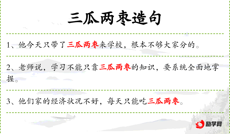 1. 【三瓜两枣】 北方口语,比喻微不足道的一点东西,或指有限的一点钱。