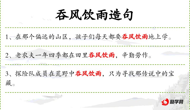 - 吞风饮雨:这个成语体现了**文化中对坚韧不拔精神的赞美。