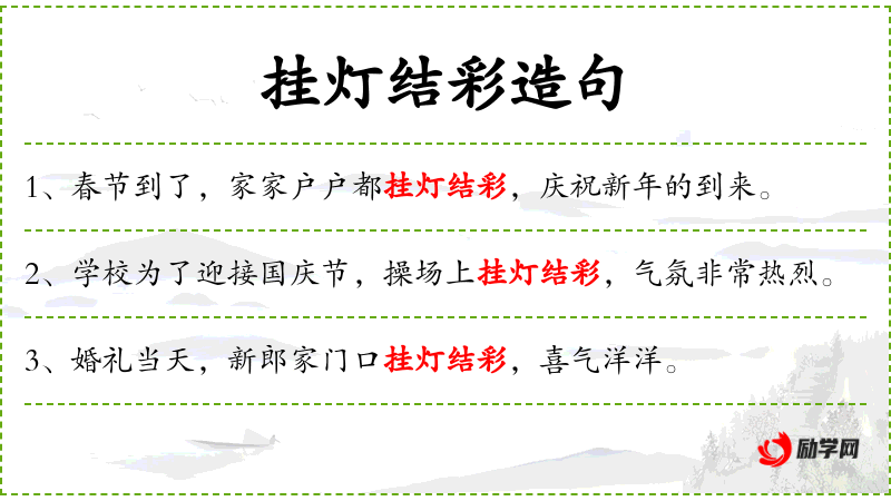 - 挂灯结彩:指装饰灯笼和彩带,增添节日气氛。