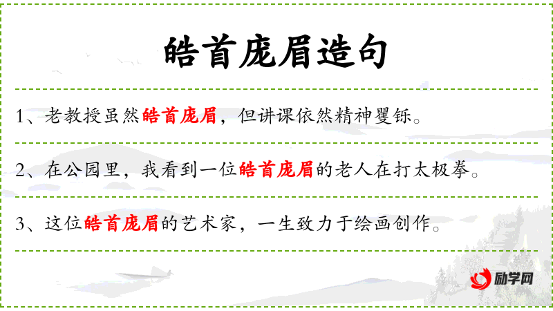 1. 【皓首庞眉】 - 皓:白的样子;庞:杂色。头发和眉毛花白。