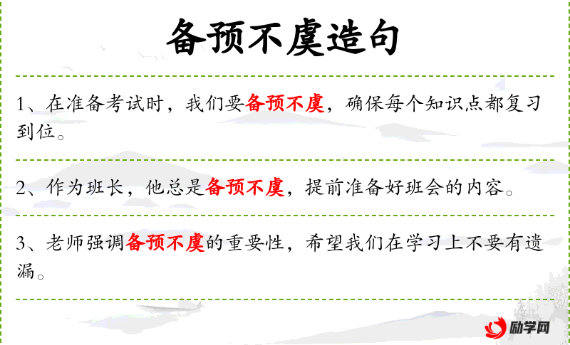 - 句子中的“备预不虞”含有一定的隐含意义,即小明不仅准备必需品,还考虑到了可能发生的意外情况。