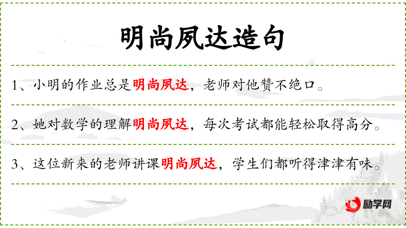 - 成语:明尚夙达,源自古代对教师教学质量的要求,强调准备充分和表达清晰。