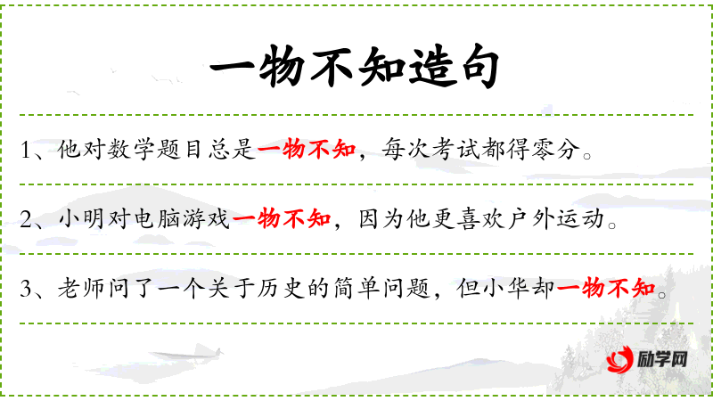 1. 【一物不知】 对某一事物有所不知。比喻知识尚有欠缺。