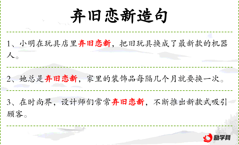 - 弃旧恋新:成语,意为抛弃旧的,喜欢新的。
