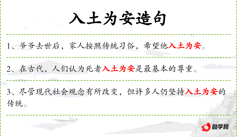 - 入土为安:成语,指人死后埋葬,引申为坚持传统观念。