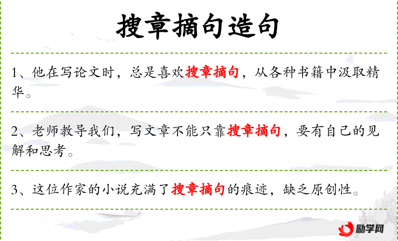 - 搜章摘句:动词短语,指从不同文章中摘取片段。