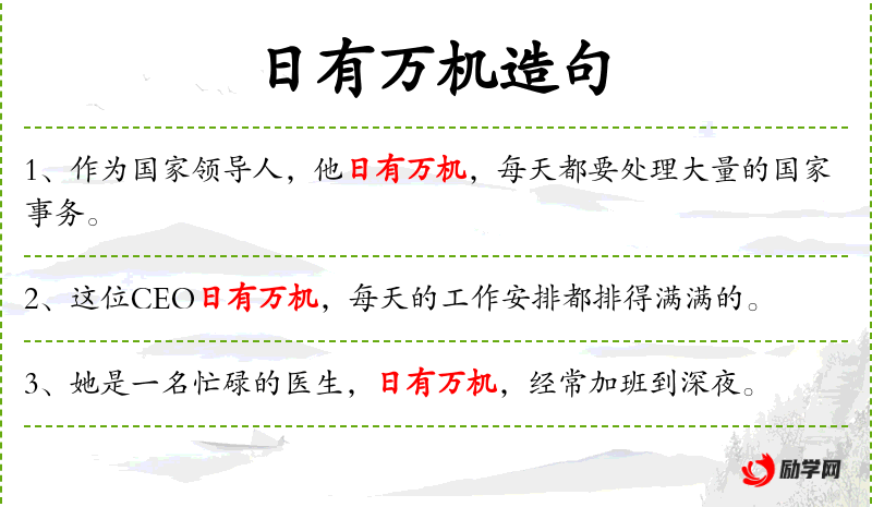 - 成语:“日有万机”源自“日理万机”,是**传统文化中形容领导者或高级官员工作繁忙的成语。