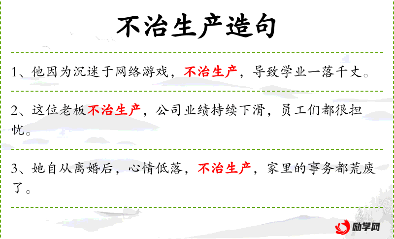 1. 【不治生产】 治:管理。指不注意或无暇料理自己的生计。