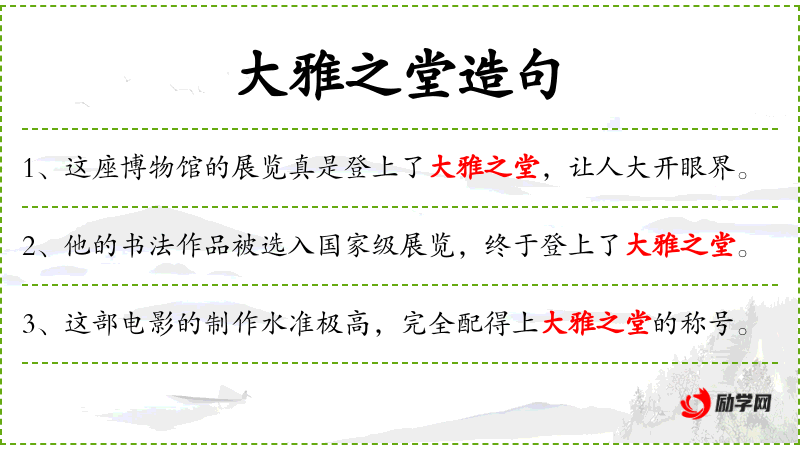 - 大雅之堂:比喻高雅的文学或艺术领域。