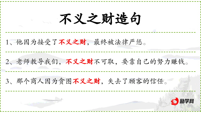 句子:“[老师教导我们,不义之财不可取,要靠自己的努力赚钱。]”