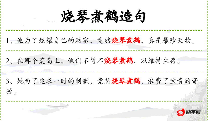 5. 【烧琴煮鹤】 - 拿琴当柴烧,把鹤煮了吃。比喻糟蹋美好的事物。