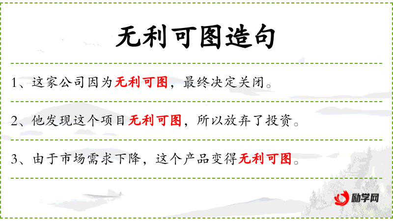 - 无利可图:形容词短语,表示没有利润或收益。 *. 开始:动词,表示动作的起点。