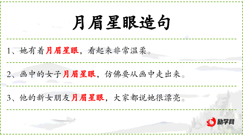 1. 【月眉星眼】 - 眉如弯月,眼似流星。形容女子容貌美丽。