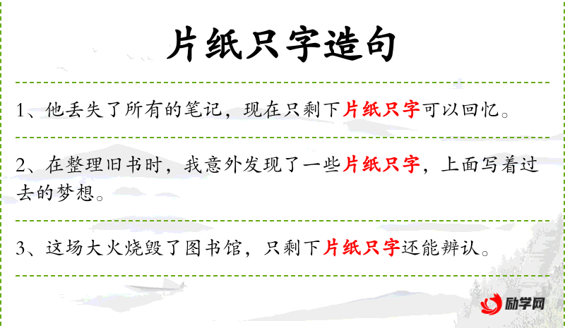 6. 【片纸只字】 不多的几句话,极少的几个字。指零碎的文字材料。
