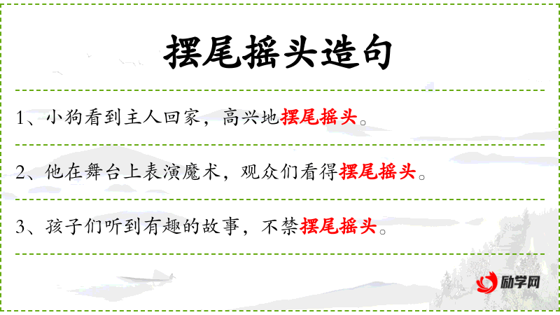- 摆尾摇头:动词短语,形象地描述了因激动而做出的动作。