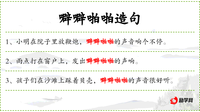 - 噼噼啪啪:拟声词,模仿鞭炮爆炸的声音。