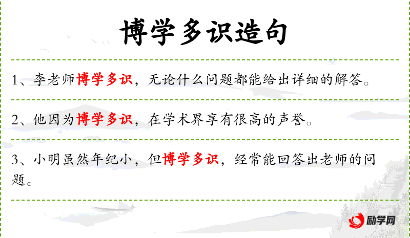 - 博学多识:形容一个人知识渊博,学识丰富。