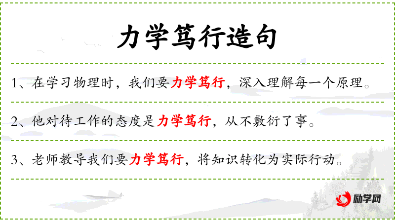 - 状语:以力学笃行的精神