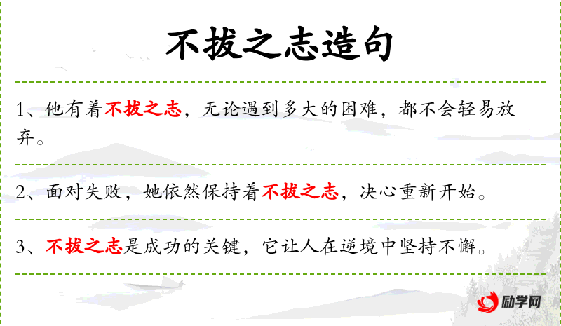 “不拔之志”体现了**文化中对坚韧不拔、持之以恒的价值观的推崇。这种表达在鼓励团队精神、强调集体努力的文化背景下尤为适用。