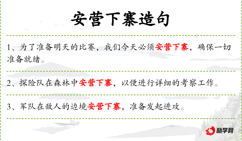 1. 【安营下寨】 安、下:建立,安置;寨:防守用的栅栏。指部队驻扎下来。也比喻建立临时的劳动或工作基地。
