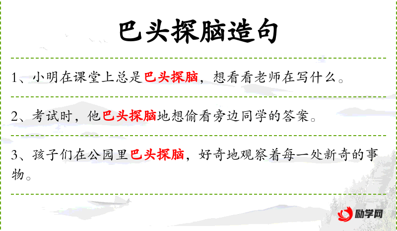 - 巴头探脑:动词短语,形容好奇地探头探脑的样子。