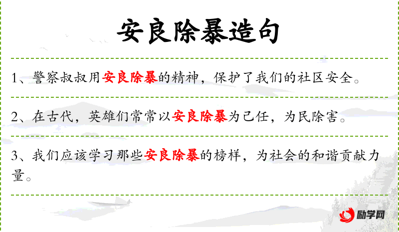 - 安良除暴:指维护正义,消除暴力。