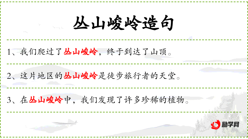 句子:“在丛山峻岭中,我们发现了许多珍稀的植物。”