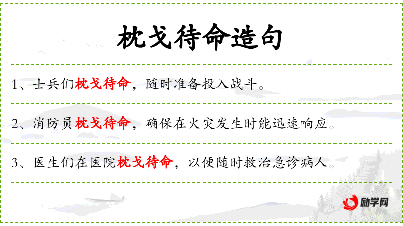 1. 【枕戈待命】 - 枕着武器等待命令。形容时刻准备战斗。