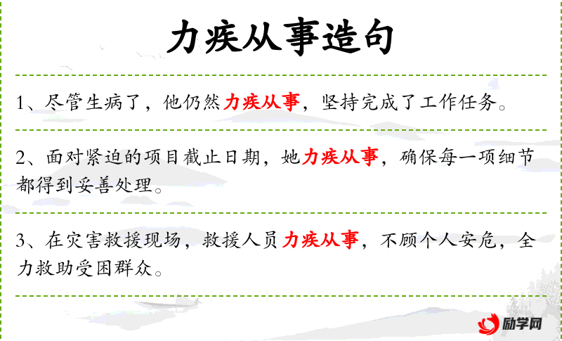 1. 【力疾从事】 力疾:带病坚持。形容克服病痛,坚持工作。
