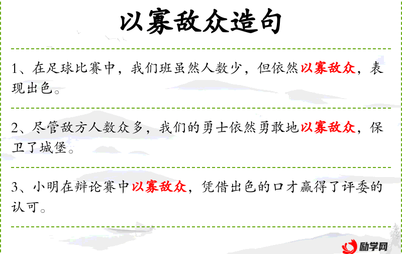 - 以寡敌众:成语,意思是少数人对抗多数人。