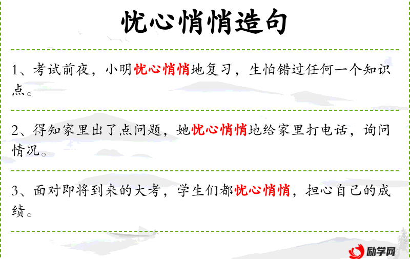 - 状语:因为担心自己的工作表现,每天都在忧心悄悄地