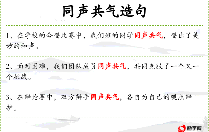 - 相关成语:“同声共气”体现了团队合作的精神。