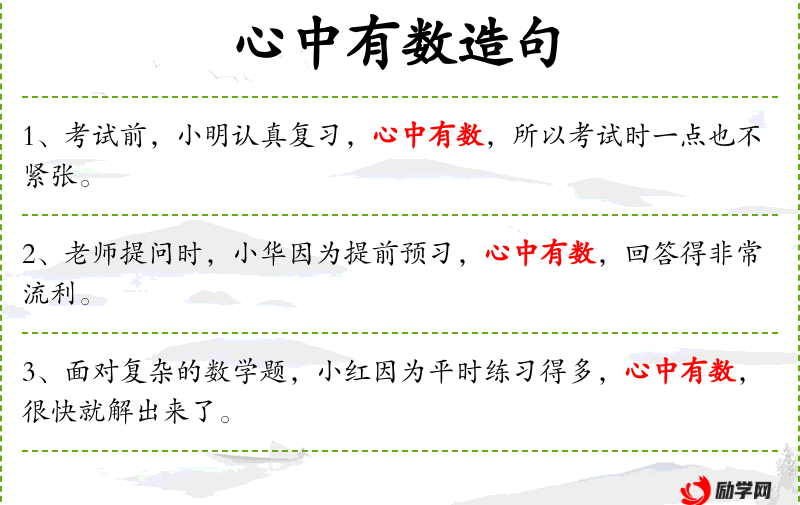 “心中有数”是一个中文成语,反映了人对于内心有把握、有计划的行为的赞赏。这个成语在的教育文化中经常被用来鼓励学生做好充分的准备。
